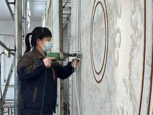 在黑龍江省藍(lán)藝地毯集團(tuán)有限公司的生產(chǎn)車(chē)間,一塊塊巨大的底布被展平、固定在半空,工人們有的拿筆對(duì)照?qǐng)D紙?jiān)诓忌献鲋鴺?biāo)記,有的兩手握著電動(dòng)織槍在布上一行行編織,一派忙碌的生產(chǎn)景象。