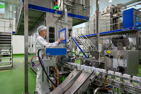 在呼和浩特市伊利現(xiàn)代智慧健康谷液態(tài)奶全球智造標(biāo)桿基地,工人在生產(chǎn)線上作業(yè)。新華社記者 李志鵬 攝