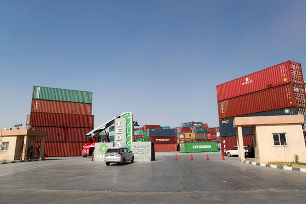 在埃及蘇伊士省的中?!ぬ┻_蘇伊士經(jīng)貿(mào)合作區(qū)拍攝的泰達保稅倉庫和二手車交易中心。資料照片