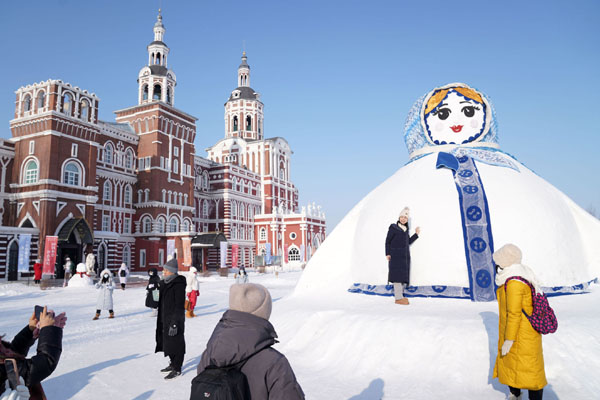 1月7日,游客在伏爾加莊園的一處大雪人前游玩、拍照。時下正值冰雪季,“冰城”哈爾濱市的著名旅游景點伏爾加莊園變身“冰雪城堡莊園”,吸引游客前來欣賞歐式建筑,享受冰雪樂趣。