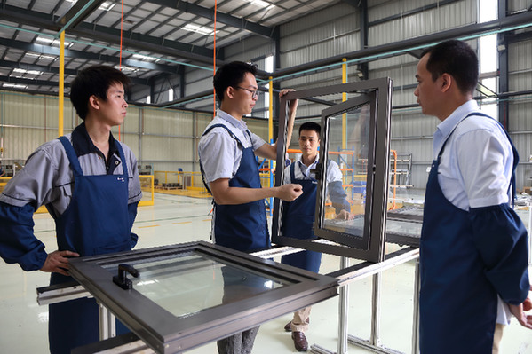在位于廣東清遠(yuǎn)的貝克洛幕墻門(mén)窗系統(tǒng)有限公司工廠內(nèi),工人正在對(duì)門(mén)窗質(zhì)量進(jìn)行檢測(cè)?!∈茉L者供圖