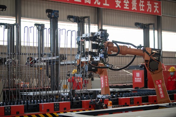 圖為“智慧梁廠”的機械臂在生產(chǎn)線上作業(yè)。位于四川會理的沿江高速“智慧梁廠”由蜀道集團投建,主要生產(chǎn)高速公路橋梁建造所需的T梁?!⌒氯A社記者 胥冰潔 攝
