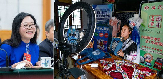 右圖:繡娘楊文麗在貴州省黔西市新仁苗族鄉(xiāng)化屋村的文創(chuàng)產(chǎn)品直播間推介苗繡文創(chuàng)產(chǎn)品(2023年5月30日攝)?!⌒氯A社記者 楊文斌 攝