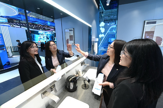 在第六屆數(shù)字中國建設(shè)成果展覽會(huì)上,參觀者現(xiàn)場了解一款衛(wèi)浴智能產(chǎn)品。記者 林善傳 攝
