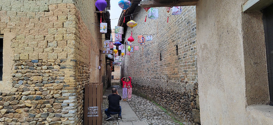 游客在太平堡景區(qū)圍屋邊拍照留影?!∮浾摺±蠲谰辍z