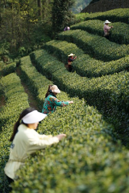 3月27日,茶農(nóng)在安康市漢濱區(qū)雙龍鎮(zhèn)一處茶山上采茶。 記者 邵瑞 攝