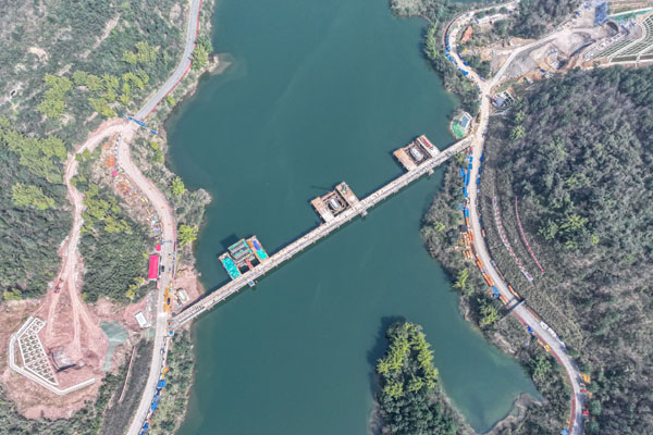 位于重慶市銅梁區(qū)的成渝中線高鐵玄天湖大橋建設(shè)現(xiàn)場(無人機(jī)照片)。