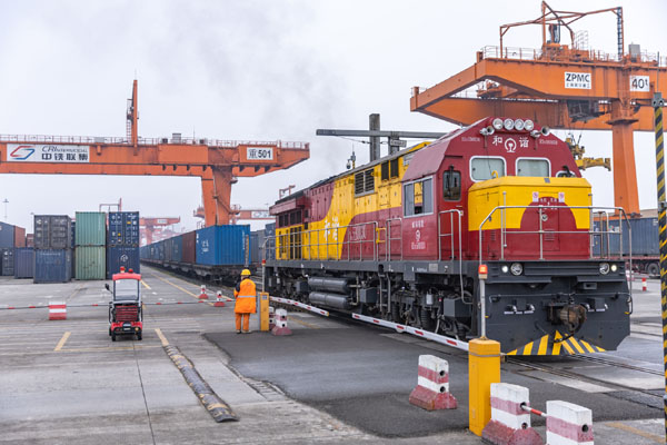 一列滿載機(jī)械設(shè)備、整車及零部件等貨物的中歐班列在重慶團(tuán)結(jié)村中心站等候發(fā)車。記者 黃偉 攝