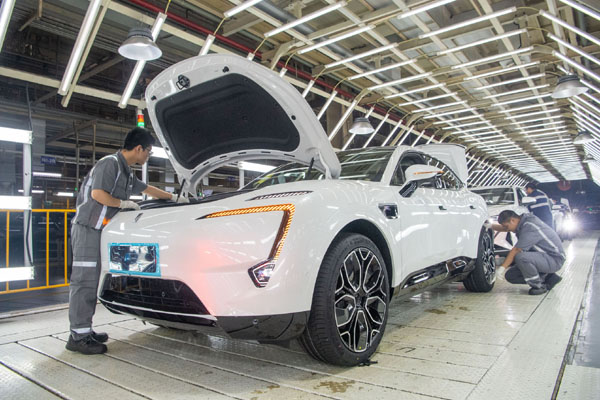 “重慶造”新能源汽車加速走向國內(nèi)外市場。在位于重慶市江北區(qū)的長安汽車生產(chǎn)基地車間內(nèi),工作人員在新能源汽車阿維塔生產(chǎn)線上作業(yè)。記者 唐奕 攝