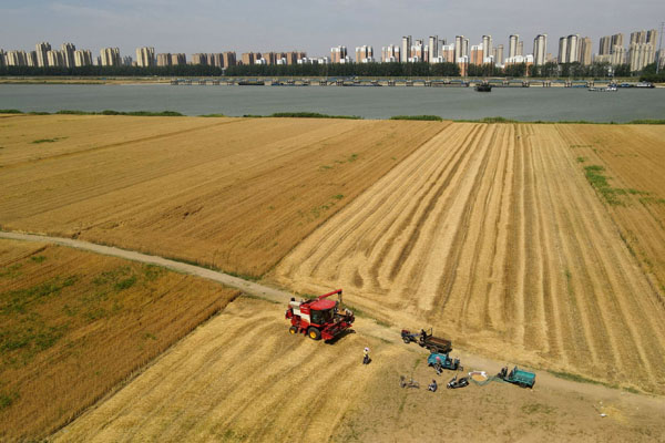 5月29日,在安徽蚌埠市五河縣朱頂鎮(zhèn)淮河岸邊,村民將收割的小麥裝車(無人機(jī)照片)。