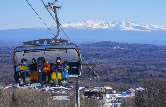 長白山西坡的萬達滑雪度假區(qū)內,雪友乘坐纜車上山?!∮浾摺≡S暢 攝