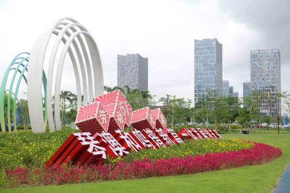 在橫琴一處廣場上拍攝的琴澳合作標(biāo)語(6月18日攝)?!∮浾摺”R漢欣 攝