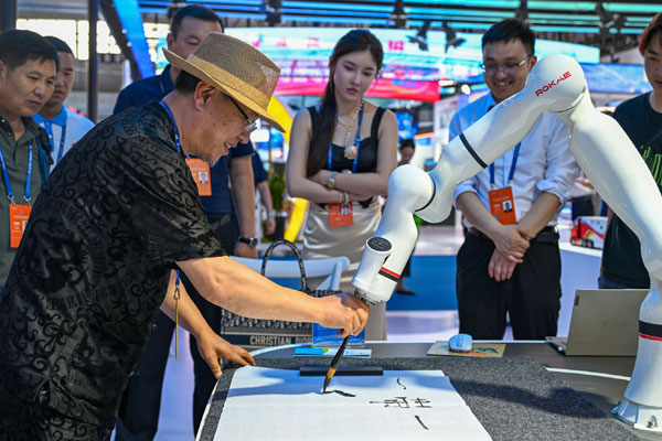 6月26日,在第八屆中國(guó)-亞歐博覽會(huì)上,參會(huì)嘉賓在山東展臺(tái)與機(jī)器人互動(dòng)。記者 陳朔 攝
