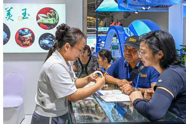 6月30日,在第八屆中國(guó)-亞歐博覽會(huì)上,觀(guān)眾在選購(gòu)和田玉。記者 陳朔 攝