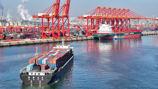 圖為一艘貨輪抵達(dá)山東港口日照港集裝箱碼頭(無人機(jī)照片)?!⌒氯A社記者 郭緒雷 攝