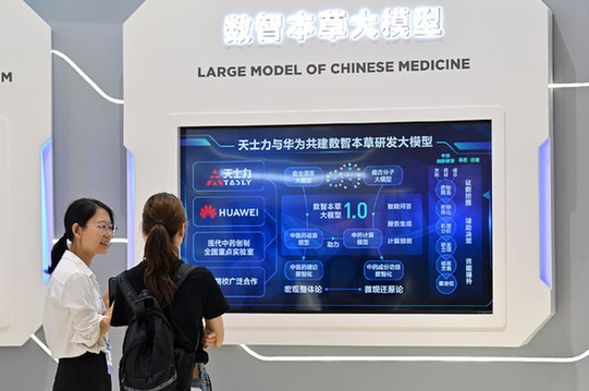 觀眾在2024世界智能產(chǎn)業(yè)博覽會(huì)上的天士力展區(qū)了解數(shù)智本草大模型?!∮浾摺±钊弧z