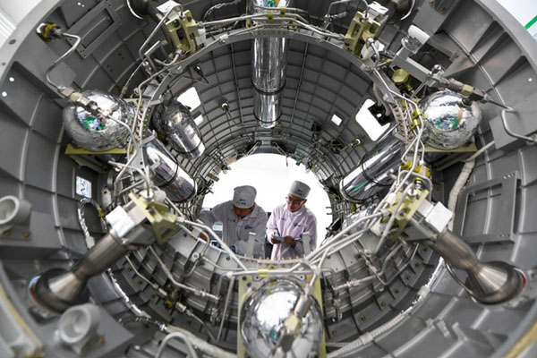 在北京星際榮耀空間科技股份有限公司,裝配測試人員在安裝液體姿軌控動力系統(tǒng)。記者 鞠煥宗 攝