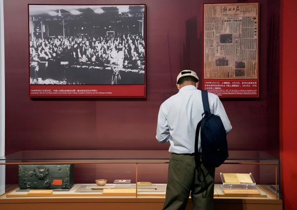 ??展柜左側,開國大典的影像資料反復播放,“中華人民共和國中央人民政府今天成立了!”天安門城樓上面向全世界的宣告,久久回蕩。