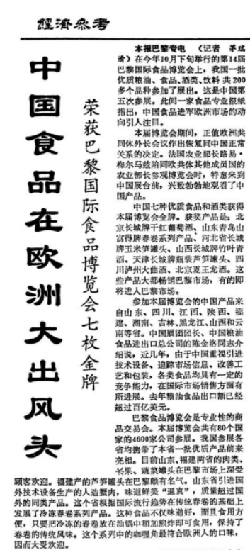 翻開(kāi)1990年11月6日《經(jīng)濟(jì)參考報(bào)》,標(biāo)題為《中國(guó)食品在歐洲大出風(fēng)頭》的文章,描寫(xiě)了第14屆巴黎國(guó)際食品博覽會(huì)上,我國(guó)一批優(yōu)質(zhì)糧油、食品、酒類(lèi)、飲料共200多個(gè)品種參加展出的場(chǎng)景。其中,中國(guó)七種優(yōu)質(zhì)食品和酒類(lèi)獲得該屆博覽會(huì)金牌,瀘州老窖所生產(chǎn)的“四川瀘州大曲酒”位列其中,在國(guó)際舞臺(tái)上展示出中國(guó)風(fēng)采。