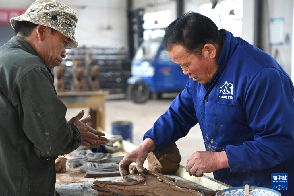 10月30日,在固原市隆德縣魏氏磚雕傳承基地,卜文?。ㄓ遥┰谏a(chǎn)車間對(duì)工人進(jìn)行指導(dǎo)。