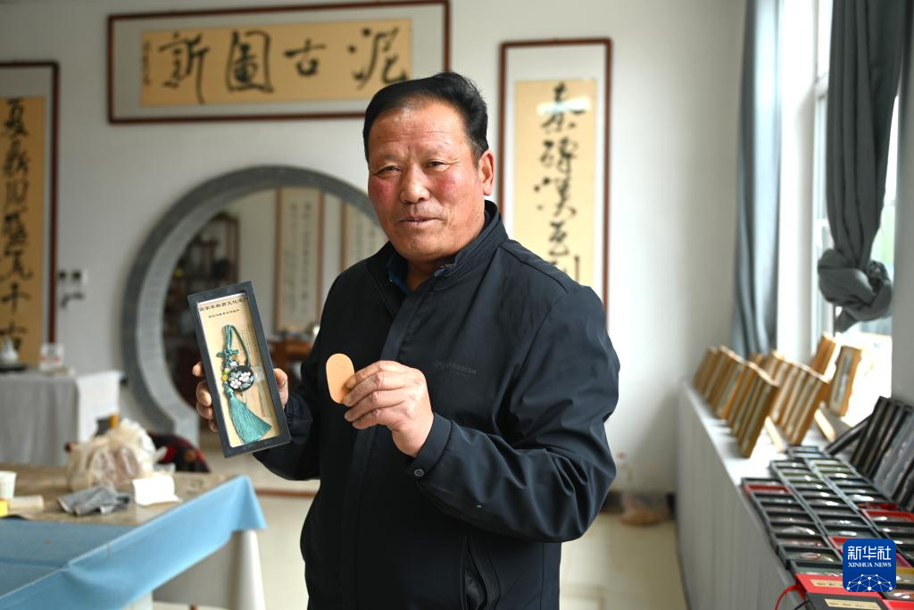 10月30日,在固原市隆德縣魏氏磚雕傳承基地,卜文俊在展示磚雕作品。