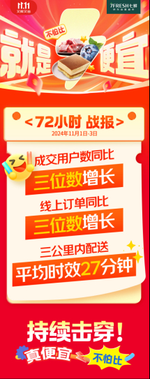 11月1日,京東七鮮超市正式開啟的“超級擊穿”活動,以“真便宜不怕比”的極致低價成功吸引海量消費(fèi)者參與。僅72小時,線上訂單數(shù)、成交用戶數(shù)均實(shí)現(xiàn)同比三位數(shù)增長,水果、蔬菜、水產(chǎn)、肉禽蛋等多品類的爆款賣至脫銷。