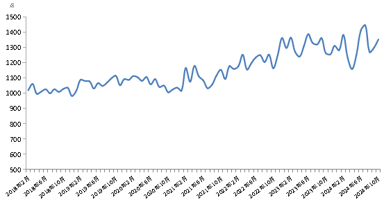 10月份,新華·中鹽食用鹽(商超)價(jià)格指數(shù)報(bào)1352.74點(diǎn),較上期(2024年9月)上漲54.74點(diǎn),漲幅4.22%;較基期(2018年1月)上漲352.74點(diǎn),漲幅35.27%;較周期內(nèi)最高點(diǎn)1445.75點(diǎn)(2024年7月)下跌93.01點(diǎn),跌幅6.59%;較周期內(nèi)最低點(diǎn)981.91點(diǎn)(2018年12月)上漲370.83點(diǎn),漲幅37.77%。