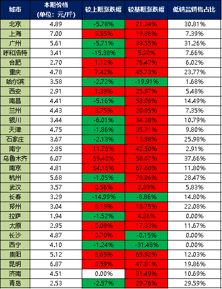 分價(jià)格區(qū)間來(lái)看,本期超市食用鹽銷售單價(jià)在5元/斤以上的城市有6個(gè),分別是上海、廣州、烏魯木齊、杭州、貴陽(yáng)、昆明;超市食用鹽銷售單價(jià)在4-5元/斤之間的城市有9個(gè),分別是北京、重慶、南昌、蘭州、天津、南京、長(zhǎng)沙、西寧、濟(jì)南;超市食用鹽銷售單價(jià)在3-4元/斤之間的城市有7個(gè),分別是呼和浩特、哈爾濱、銀川、石家莊、武漢、長(zhǎng)春、鄭州;超市食用鹽銷售單價(jià)在3元/斤以下的城市有6個(gè),分別是合肥、西安、南寧、拉薩、太原、青島。