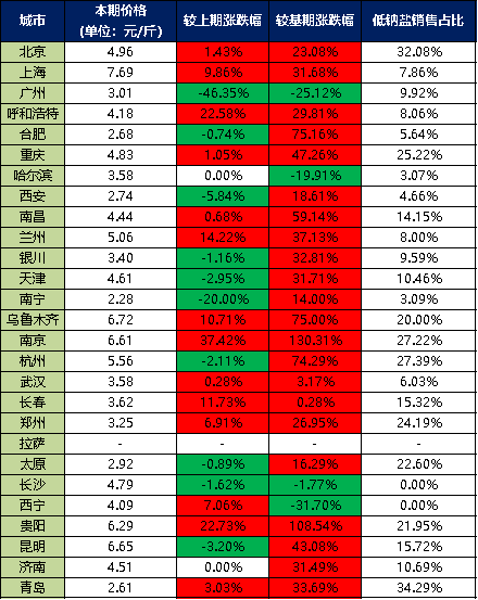 分價(jià)格區(qū)間來(lái)看,本期超市食用鹽銷(xiāo)售單價(jià)在5元/斤以上的城市有7個(gè),分別是上海、蘭州、烏魯木齊、南京、杭州、貴陽(yáng)、昆明;超市食用鹽銷(xiāo)售單價(jià)在4-5元/斤之間的城市有8個(gè),分別是北京、呼和浩特、重慶、南昌、天津、長(zhǎng)沙、西寧、濟(jì)南;超市食用鹽銷(xiāo)售單價(jià)在3-4元/斤之間的城市有6個(gè),分別是廣州、哈爾濱、銀川、武漢、長(zhǎng)春、鄭州;超市食用鹽銷(xiāo)售單價(jià)在3元/斤以下的城市有5個(gè),分別是合肥、西安、南寧、太原、青島。