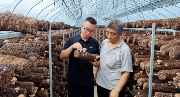 茅臺集團駐道真縣長壩村第一書記龔利科和菇農(nóng)交流菌菇種植情況