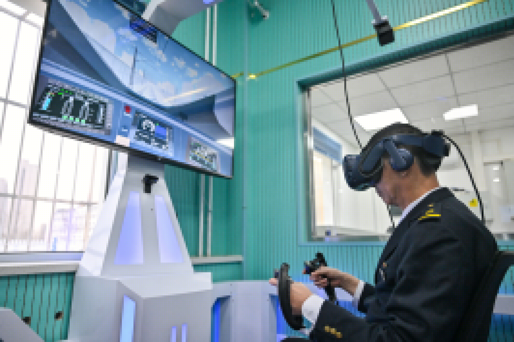 世界首條智能高鐵京張高鐵即將迎來通車五周年。據(jù)了解,通車近五年來,鐵路部門通過5G技術(shù)、北斗系統(tǒng)、智慧大腦、機(jī)器人檢修等各種科技手段,保障京張高鐵安全平穩(wěn)運(yùn)行。圖為近日在國鐵北京動(dòng)車段北京北動(dòng)車運(yùn)用所,動(dòng)車組司機(jī)安秀旗使用VR模擬駕駛設(shè)備訓(xùn)練。