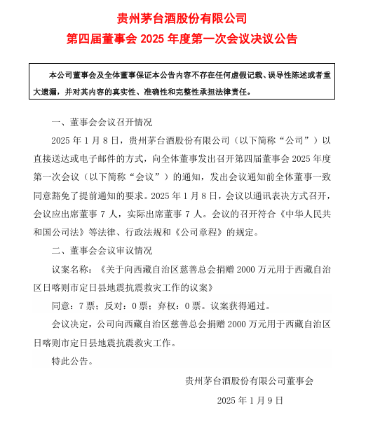地震發(fā)生后,貴州茅臺第一時間啟動救災響應,于1月8日召開第四屆董事會2025年度第1次會議,做出以上決定。