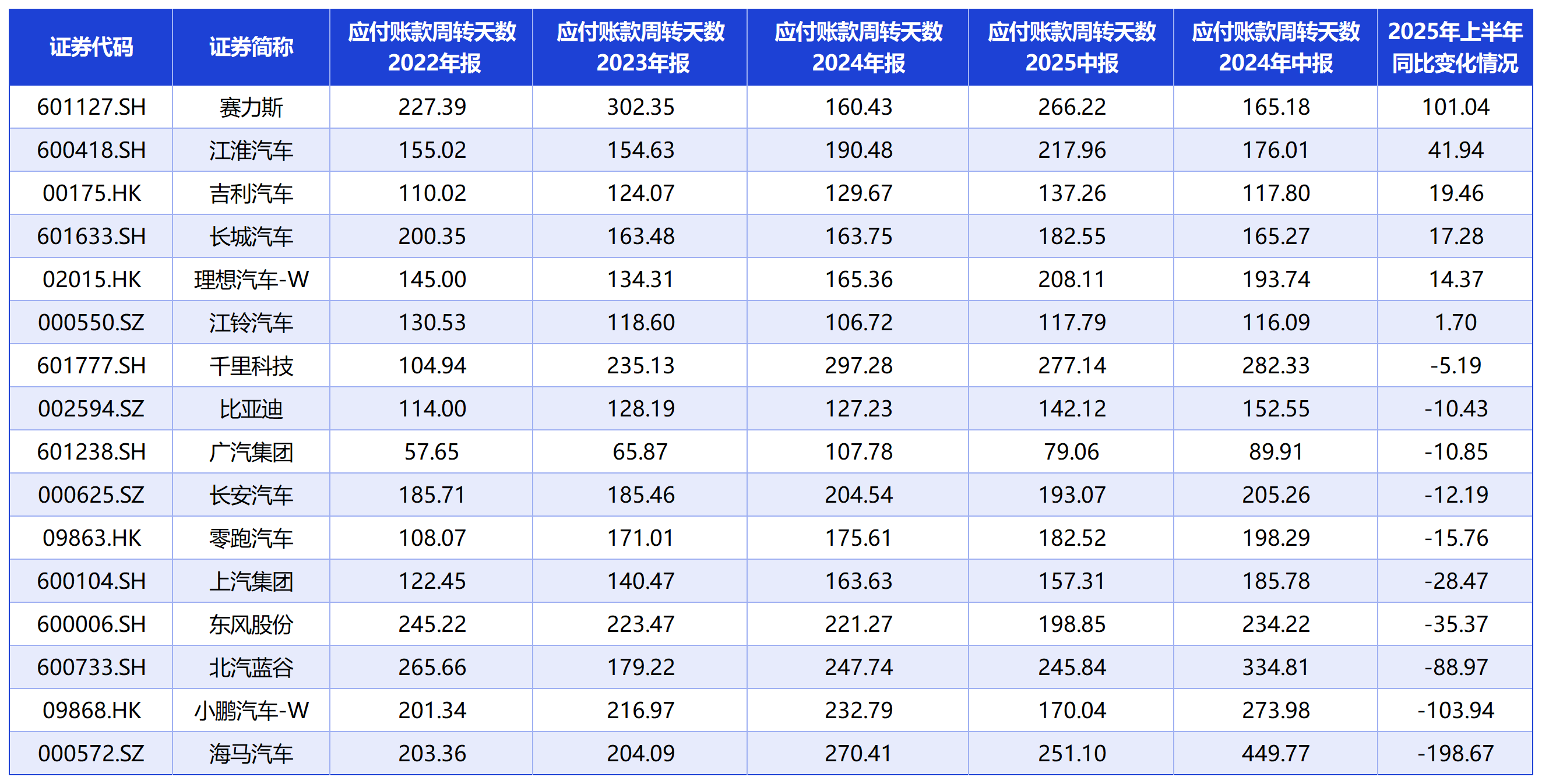 整體來看,2025年上半年,16家上市車企應(yīng)付貿(mào)易款項平均數(shù)為595.29億元,較年初下降6.21%;中位數(shù)為304.45億元,較2024年年底增加3.95%。這表明頭部車企現(xiàn)金流改善、主動壓降對供應(yīng)商負(fù)債,是“降大頭”的主力,而體量居中或偏小車企對上游占款仍在擴張,資金鏈依舊緊繃。