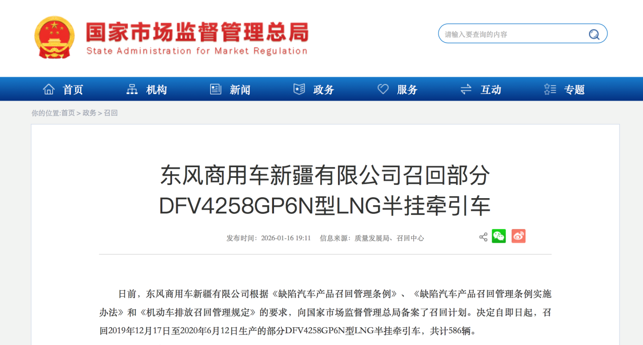 市場(chǎng)監(jiān)管總局網(wǎng)站消息顯示,日前,東風(fēng)商用車新疆有限公司根據(jù)《缺陷汽車產(chǎn)品召回管理?xiàng)l例》、《缺陷汽車產(chǎn)品召回管理?xiàng)l例實(shí)施辦法》和《機(jī)動(dòng)車排放召回管理規(guī)定》的要求,向國家市場(chǎng)監(jiān)督管理總局備案了召回計(jì)劃。決定自即日起,召回2019年12月17日至2020年6月12日生產(chǎn)的部分DFV4258GP6N型LNG半掛牽引車,共計(jì)586輛。