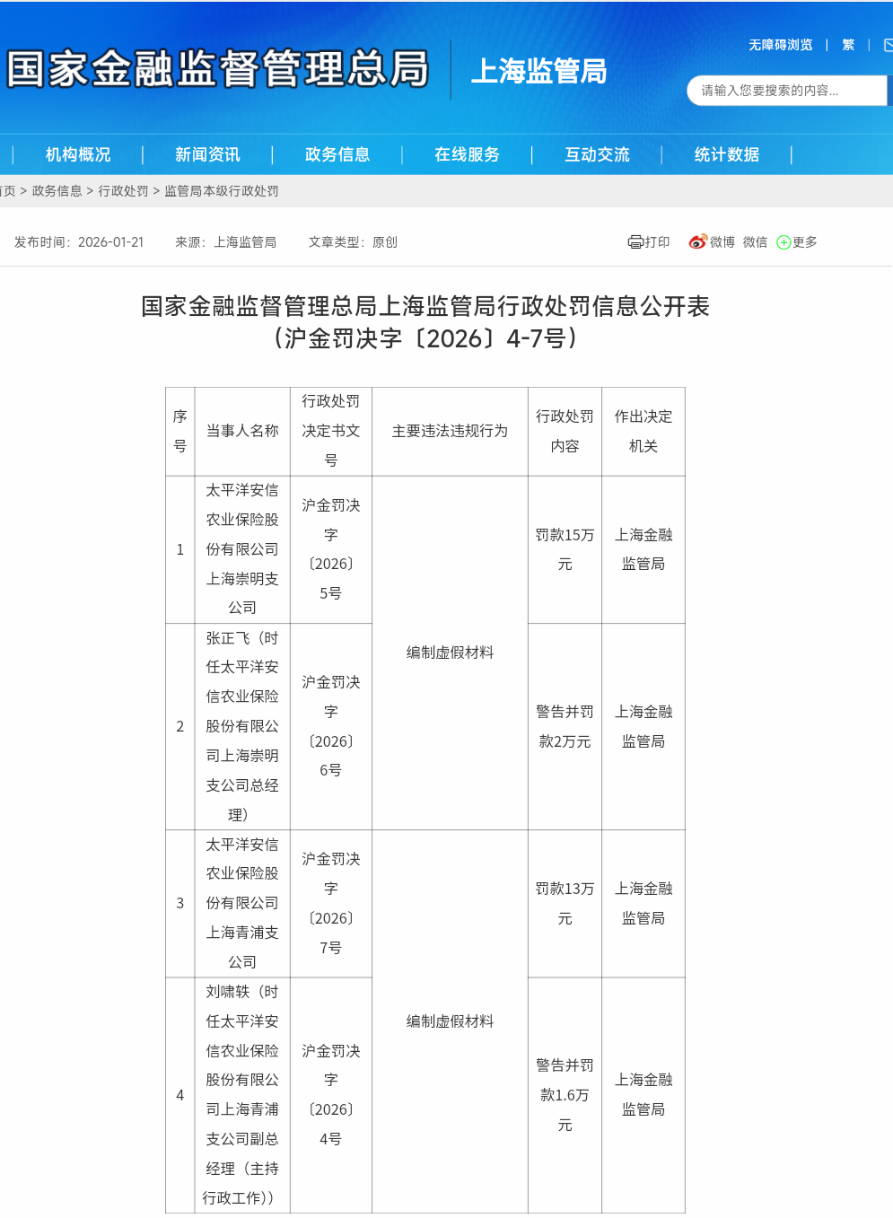 1月21日,國家金融監(jiān)督管理總局上海監(jiān)管局公布行政處罰決定,太平洋安信農(nóng)業(yè)保險股份有限公司(簡稱“太平洋安信農(nóng)險”)上海崇明支公司、青浦支公司因存在編制虛假材料的違法違規(guī)行為,分別被處以15萬元、13萬元罰款,兩家機構(gòu)合計罰款28萬元。時任兩公司相關(guān)負責(zé)人分別被給予警告并罰款2萬元、1.6萬元。