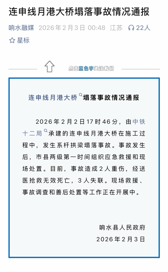 2月3日凌晨,江蘇省鹽城市響水縣人民政府通報(bào)稱(chēng),2026年2月2日17時(shí)46分,由中鐵十二局承建的連申線月港大橋在施工過(guò)程中,發(fā)生系桿拱梁塌落事故。事故發(fā)生后,市縣兩級(jí)第一時(shí)間組織應(yīng)急救援和現(xiàn)場(chǎng)處置。目前,事故造成2人重傷,經(jīng)送醫(yī)搶救無(wú)效死亡,3人失聯(lián)。現(xiàn)場(chǎng)救援、事故調(diào)查和善后處置等工作正在開(kāi)展中。