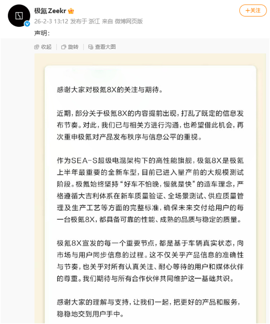 2月3日,極氪汽車官方微博號發(fā)布聲明稱,近期有部分關于極氪8X的內(nèi)容提前出現(xiàn),打亂了既定的信息發(fā)布節(jié)奏。對此,極氪汽車已與相關方進行溝通,也借此機會再次重申極氪對產(chǎn)品發(fā)布秩序與信息公平的重視。