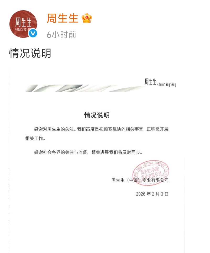 記者注意到,2月3日,“周生生”微博發(fā)布一則情況說明顯示:“感謝對周生生的關(guān)注。我們高度重視顧客反映的相關(guān)事宜,正積極開展相關(guān)工作。感謝社會各界的關(guān)注與監(jiān)督,相關(guān)進展我們將及時同步?!?/p>