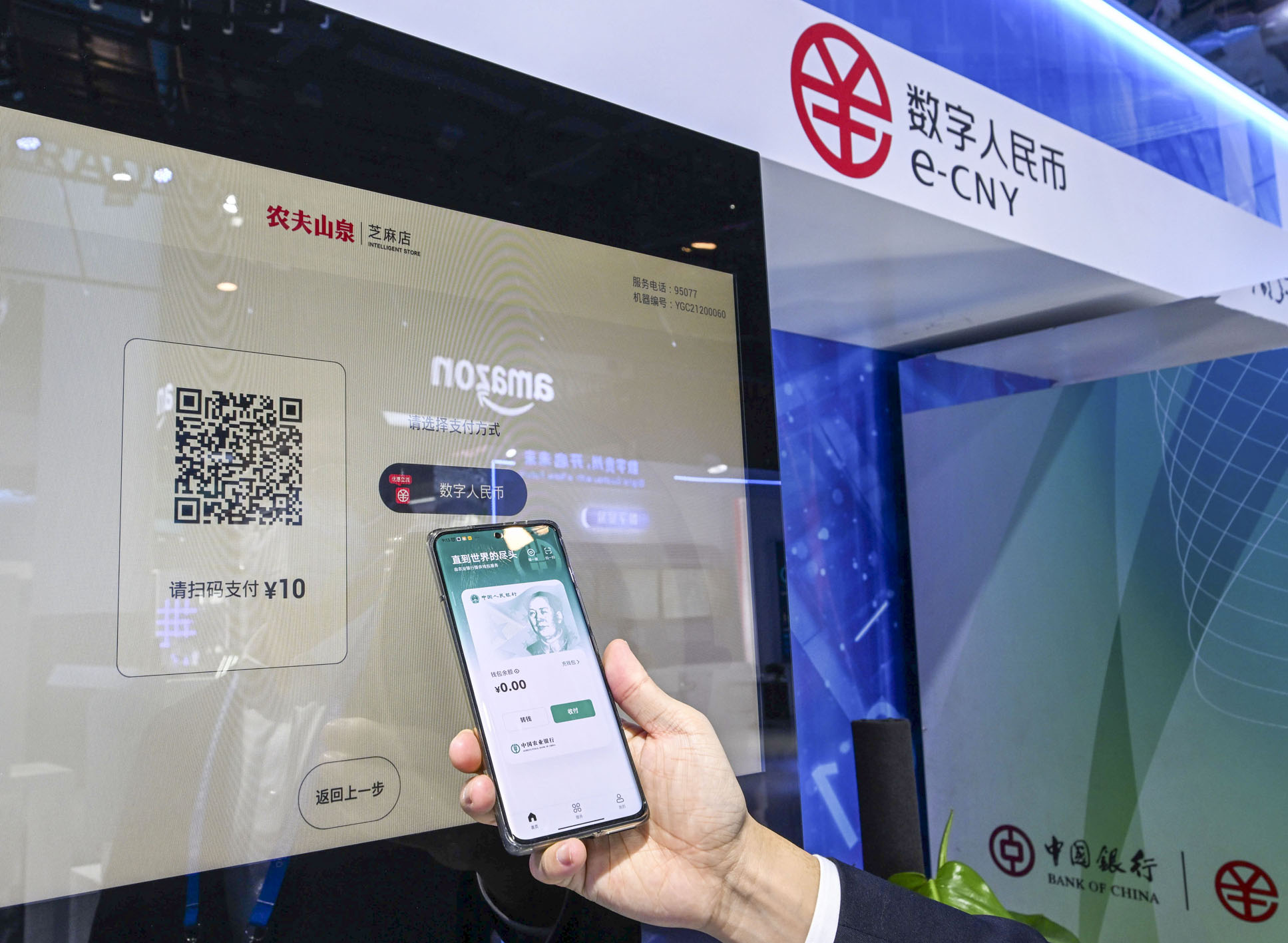 工作人員在首屆全球數(shù)字貿(mào)易博覽會(huì)上展示數(shù)字人民幣的應(yīng)用場(chǎng)景。新華社記者 徐昱 攝