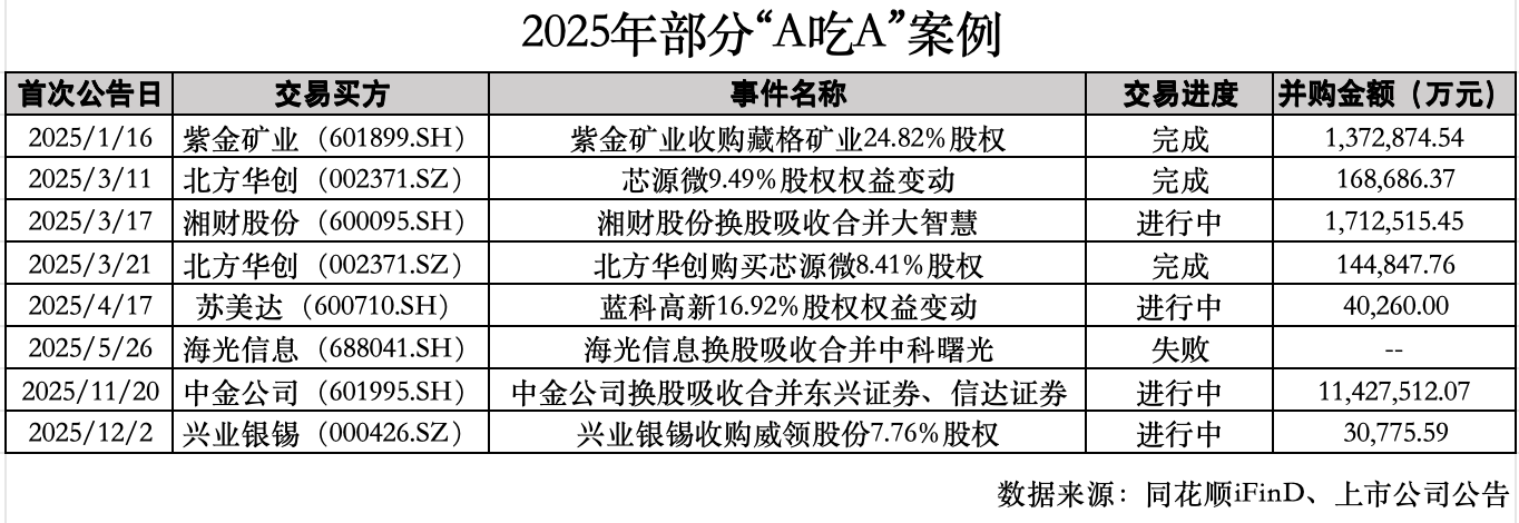 回溯剛剛過去的2025年,在政策紅利與產(chǎn)業(yè)升級(jí)雙輪驅(qū)動(dòng)下,這一態(tài)勢(shì)得以延續(xù)。據(jù)記者不完全統(tǒng)計(jì),2025年至少涌現(xiàn)了7起“A吃A”案例,與2024年基本持平,涵蓋機(jī)械設(shè)備、非銀金融、計(jì)算機(jī)、電子等多個(gè)行業(yè)。