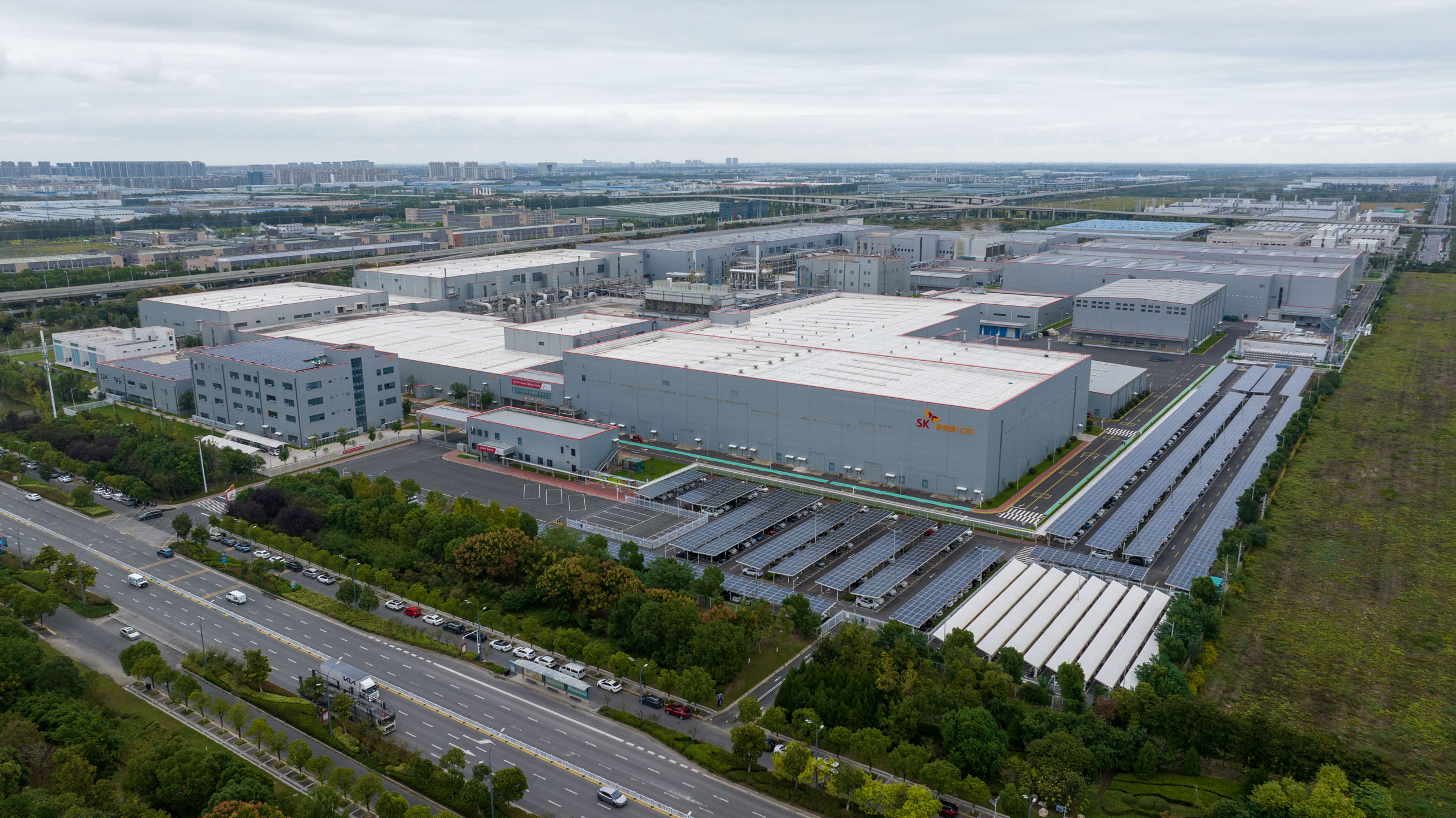 位于中韓(鹽城)產(chǎn)業(yè)園內(nèi)的SK新能源一期動(dòng)力電池生產(chǎn)基地(無人機(jī)照片)。新華社記者 李博 攝