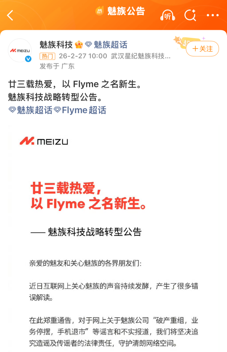 2月27日,魅族科技通過(guò)官方微博發(fā)布戰(zhàn)略轉(zhuǎn)型公告,針對(duì)近期網(wǎng)絡(luò)上流傳的“手機(jī)業(yè)務(wù)停擺、團(tuán)隊(duì)解散、破產(chǎn)重組”等傳聞作出正式回應(yīng),同時(shí)宣布公司重大業(yè)務(wù)調(diào)整與戰(zhàn)略方向。