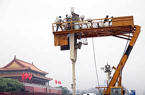 工人乘坐升降車為北京天安門城樓西側(cè)的華燈更換新型節(jié)能光源。新華社發(fā) | “雖然去年節(jié)能減排任務(wù)沒能完成,但從某個(gè)角度來看,卻體現(xiàn)了政府執(zhí)政能力的進(jìn)步,至少是勇于提出挑戰(zhàn),直面問題!比珖舜蟠、皇明太陽能集團(tuán)有限公司董事長黃鳴表示,“敢于直面問題才會(huì)有所突破。溫總理已經(jīng)在政府工作報(bào)告中表示,今年要把節(jié)能降耗、保護(hù)環(huán)境和集約用地作為轉(zhuǎn)變經(jīng)濟(jì)增長方式的突破口和重要抓手,由此可見,2007年的節(jié)能減排將成為經(jīng)濟(jì)工作的重中之重,也是關(guān)系到整個(gè)‘十一五’期間節(jié)能減排指標(biāo)能否順利實(shí)現(xiàn)的關(guān)鍵之所在! “政府工作報(bào)告中對(duì)節(jié)能減排給予了高度重視,這是此前從未有過的!弊叱鋈嗣翊髸(huì)堂,來自香港特別行政區(qū)的全國人大代表王英偉這樣告訴記者,“從溫總理的政府工作報(bào)告中,我們可以深切的體會(huì)到,國家已經(jīng)認(rèn)識(shí)到了節(jié)能減排的重要性,如果高耗能、高排放的情況不能盡快改善,我國在今后的發(fā)展中就會(huì)遇到很多瓶頸,從而對(duì)國家的進(jìn)一步發(fā)展造成很大制約! 王英偉表示,盡管政府在節(jié)能減排方面有很大決心,但2007年的節(jié)能減排任務(wù)仍相當(dāng)艱巨!皽乜偫碓谡ぷ鲌(bào)告中指出了今年節(jié)能環(huán)保方面的八個(gè)重點(diǎn),但這些想法一定要落實(shí)到地方政府,希望地方政府能夠加大力度去執(zhí)行,這是節(jié)能減排任務(wù)能否完成的關(guān)鍵!