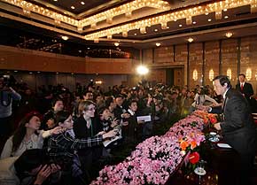 其實(shí),不光是馬凱頗為“照顧”海外記者,該場(chǎng)新聞發(fā)布會(huì)的新聞官更是對(duì)外國(guó)記者和港澳臺(tái)記者分外“關(guān)照”。距離新聞發(fā)布會(huì)結(jié)束還有短暫的幾分鐘,全場(chǎng)幾百名記者都舉起手來爭(zhēng)取機(jī)會(huì),但是新聞官彭放卻宣布:“下一個(gè)問題想留給臺(tái)灣記者,有沒有臺(tái)灣記者想提問的?”此言一出,記者們舉起的手只得無奈地放下,沉靜了幾秒鐘后,一位記者突然高喊:“沒有臺(tái)灣記者,香港記者可不可以問。俊