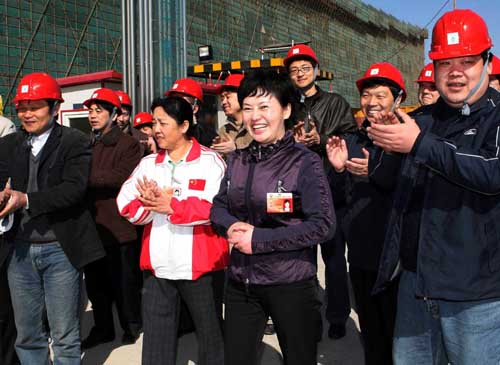 3月10日,全國政協(xié)委員趙喜林(前右二)和張小玲(前右三)利用會議休息時間,來到北京奧林匹克國家會議中心工地看望農(nóng)民工,并給工人們送來毛巾、香皂等生活用品。