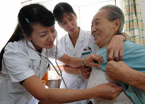 如何讓老百姓盡量少花錢看好?陳海嘯代表認(rèn)為,除提高醫(yī)務(wù)人員技術(shù)水平和從醫(yī)道德,規(guī)范醫(yī)院發(fā)展方向、促進(jìn)醫(yī)療體制改革,實(shí)行醫(yī)藥分家等措施外,還應(yīng)制定一個(gè)作為行醫(yī)治病標(biāo)準(zhǔn)的疾病診療指南。 圖為沈陽市和平區(qū)新興社區(qū)衛(wèi)生服務(wù)中心大夫杜雪梅(左)和馬荏秋(中)在為夏春英老人檢查身體(資料照片)。