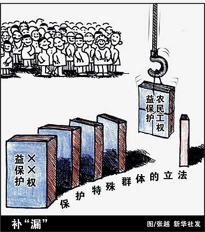 目前,全國農(nóng)民工數(shù)量有1.5億人,依法保護他們的合法權(quán)益是構(gòu)建和諧社會重點內(nèi)容。兩會期間代表委員們建議,應盡快制定出臺農(nóng)民工權(quán)益保護法,從根本上為農(nóng)民工依法維權(quán)提供法律上、制度上的保障。 代表委員們同時指出,這部法律應當確立農(nóng)民工的正當社會地位,明確規(guī)定農(nóng)民工合法勞動報酬不受侵犯;農(nóng)民工在城市的集體住所和私人住所不受侵犯;農(nóng)民工及其家人能真正享有普通城市公民一樣的城市生活等一系列合法權(quán)益。
