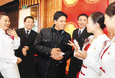 3月2日,農(nóng)民工全國人大代表、重慶城建集團(tuán)農(nóng)工班班長(zhǎng)康厚明(中)來到北京一家重慶餐館,征求重慶籍外來工的意見。會(huì)上,他將就農(nóng)民工醫(yī)療、工傷保險(xiǎn)等問題提出相關(guān)建議。