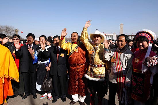 3月3日,中國人民政治協(xié)商會議第十一屆全國委員會第一次會議在北京人民大會堂開幕。這是幾名全國政協(xié)委員進(jìn)入會場前愉快地招手致意。