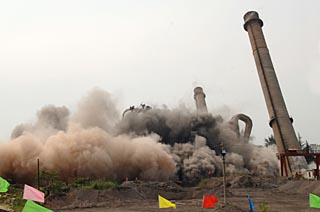 | 2007年9月5日,山東炸響拆除小火電“全國第一爆”。山東省微山湖煤電公司8臺燃煤小火電機組的主廠房和兩座煙囪被爆破拆除。新華社記者